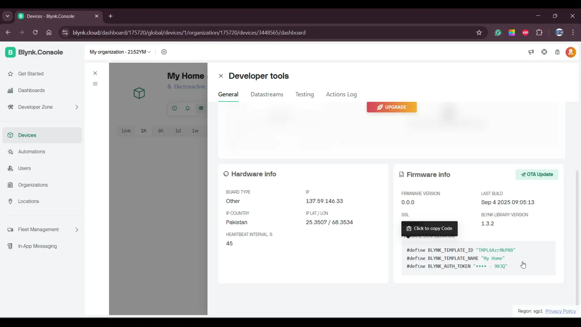 When you open the Blynk app on your phone, you will see the device that you created earlier. In my case, it’s showing up as “My Home.”