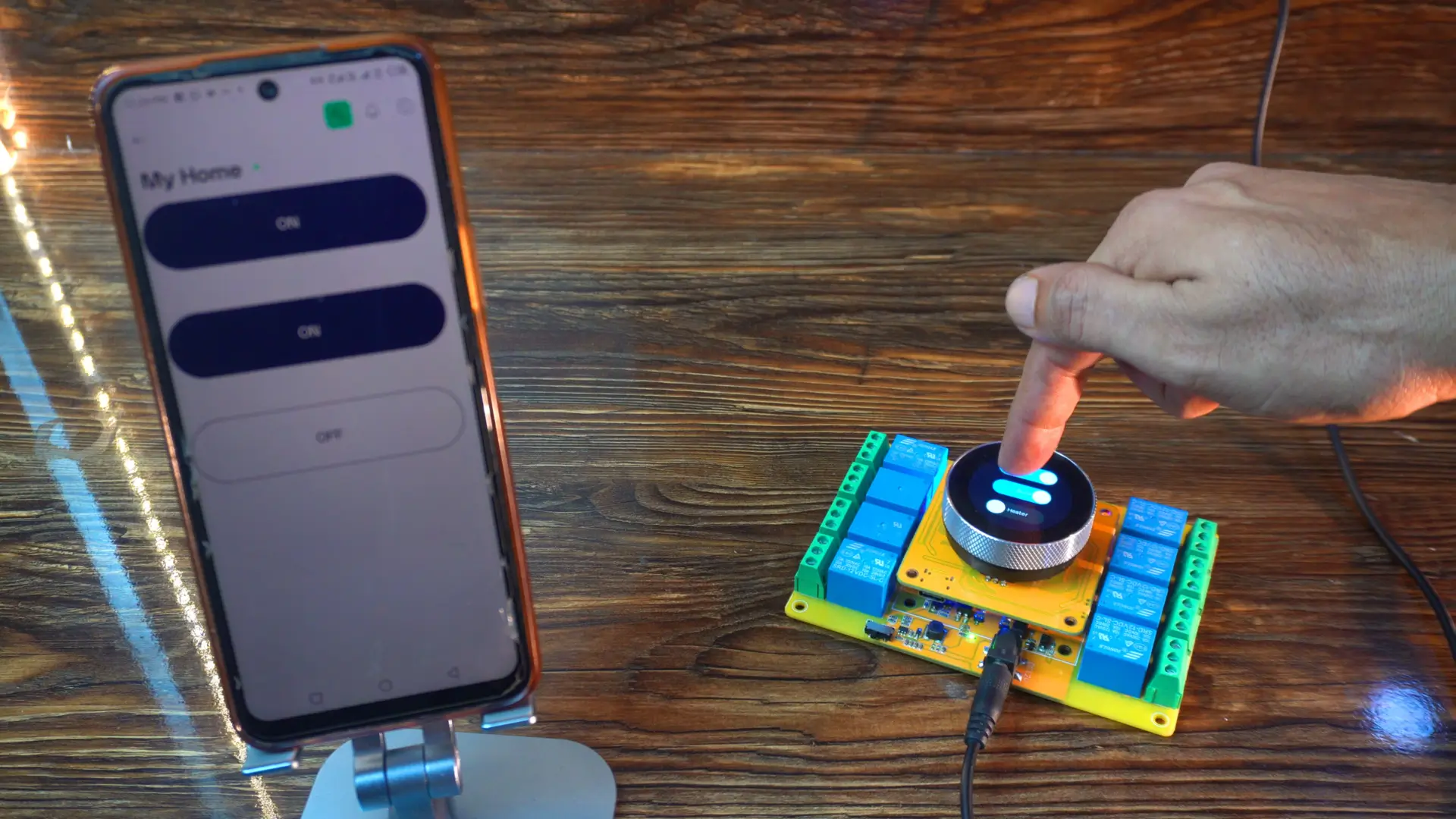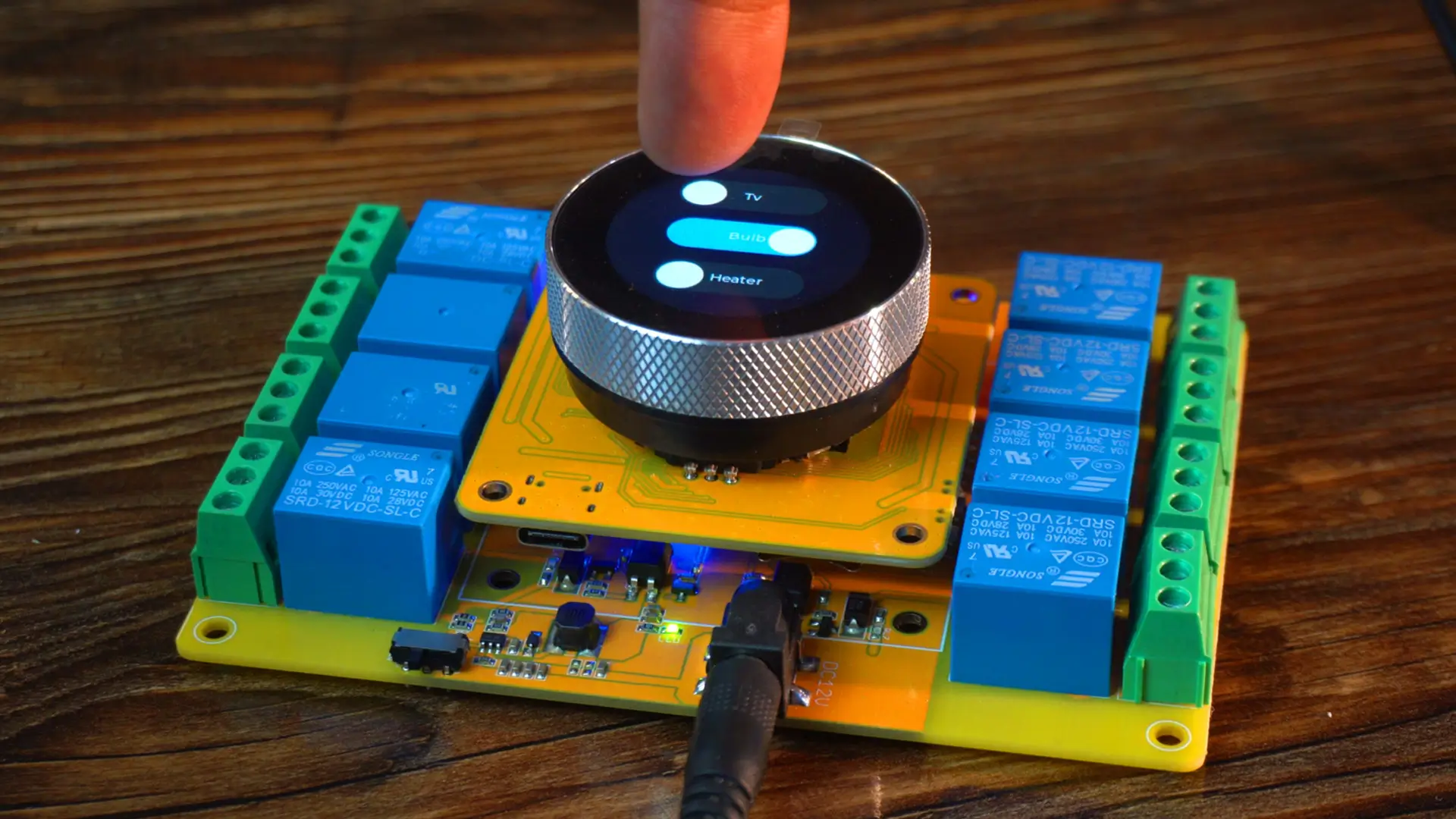 We controlled relays using the on-screen UI designed in Squareline Studio, and we also used the encoder and physical buttons for quick access.