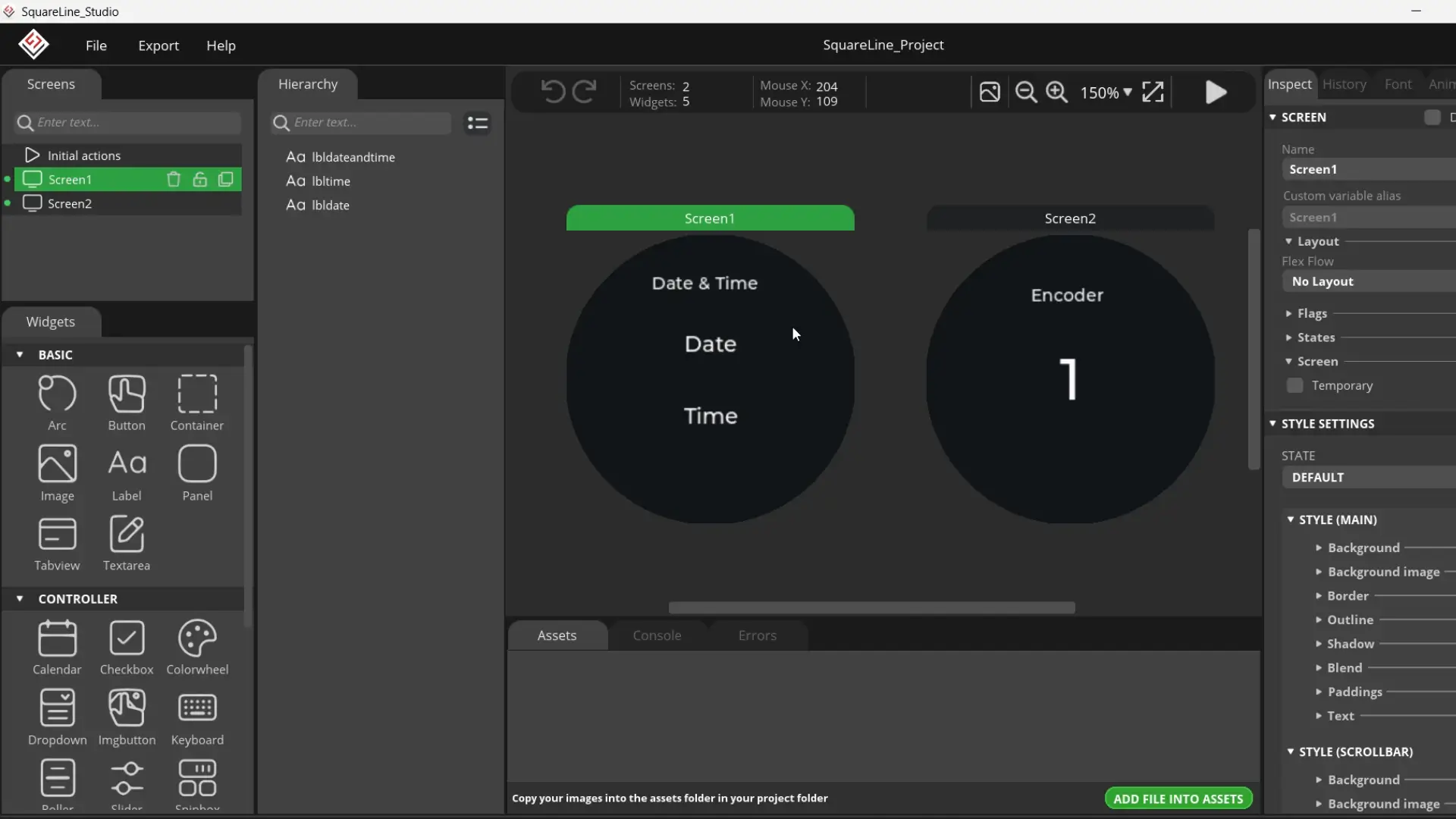 I have once again modified the template project, and this time on Screen1, I will be displaying the Date and Time. I have already written several articles on digital and analog watches, so for the basics you can check those out; because repeating the same things again and again can get a bit boring. On Screen2, we will be display the encoder value.